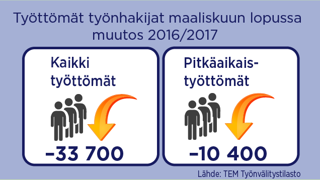 Vid arbets- och näringsbyråerna fanns det i slutet av mars sammanlagt 317 300 arbetslösa arbetssökande. Det är 33 700 färre än ett år tidigare. Från föregående månad minskade antalet arbetslösa arbetssökande med 14 900. Uppgifterna framgår av arbets- och näringsministeriets sysselsättningsöversikt.
