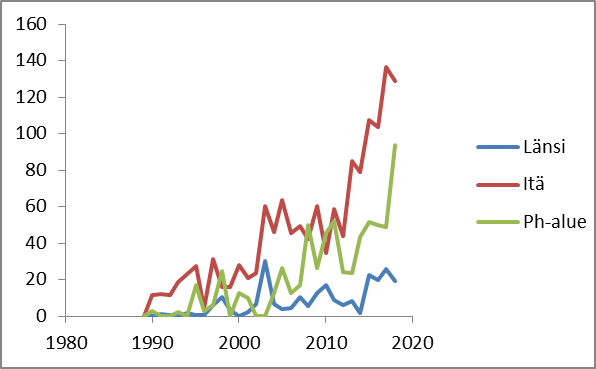 | Kuva 1. Riistakolmioiden talvilaskentoihin pohjautuva laskelma ahmojen lukumäärästä kolmella alueella vuosina 1989–2018. Lähde. Luken kanta-arvio 27.11.2018. |