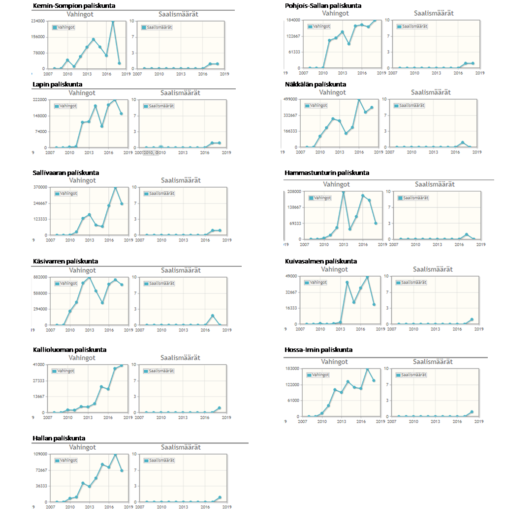 Viime talvea koskeva arvio ahmojen lukumäärästä on noin 20 % suurempi kuin kahta edellistä talvea koskenut arvio (220–250), ja riistakolmioaineiston perusteella ahmojen määrä poronhoitoalueella ja itäisellä kannanhoitoalueella on jopa moninkertaistunut viimeisten 15–20 vuoden aikana (kuva 1).