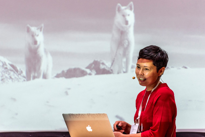 | Pipaluk Lykke kertoi tilaisuudessa Arctic Nomads-hankkeesta, jolla pyritään vahvistamaan Grönlannin inuiittien perinteistä koiravaljakkokulttuuria. Hanke tarjoaa inuiiteille elinkeinomahdollisuuksia ja parantaa heidän fyysistä ja henkistä terveyttään. Koiravaljakkokulttuuri on vahvaa myös Alaskassa ja Kanadassa. Kuva: Otto Ponto |