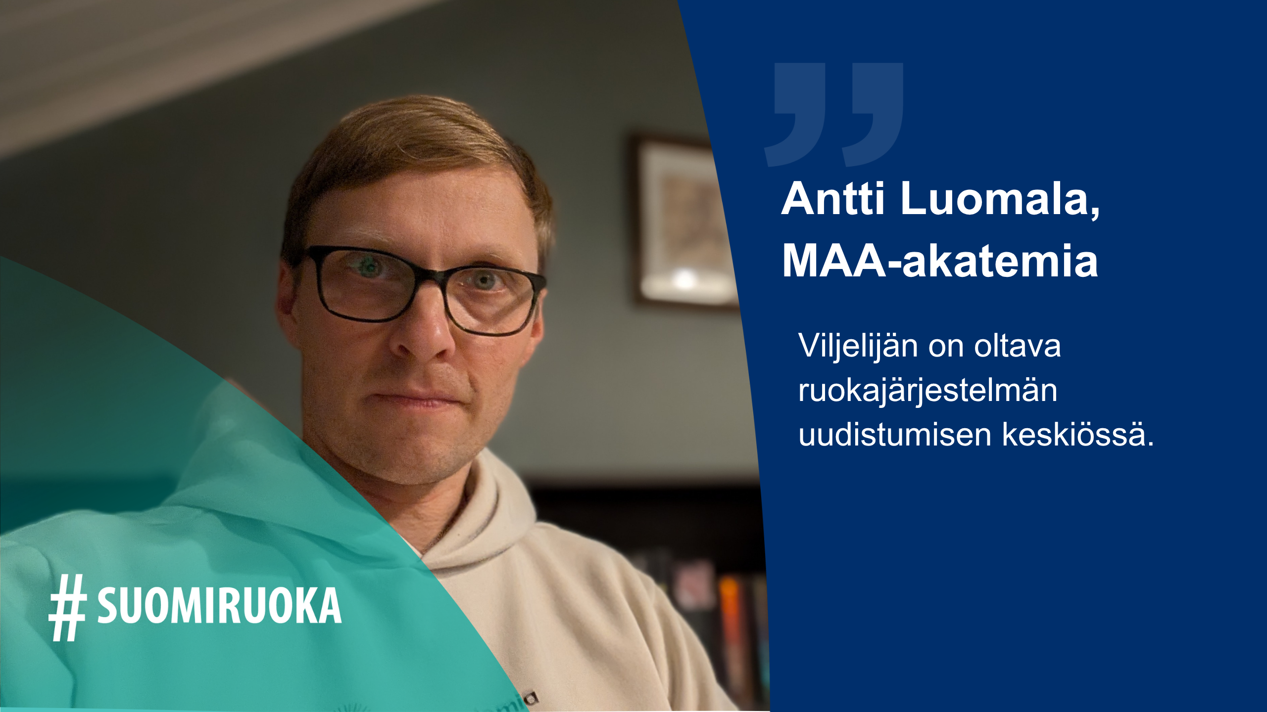 Antti Luomala on MAA-akatemia osuuskunnan perustaja, toimitusjohtaja ja maatilaneuvoja. MAA-akatemia on viljelijöiden, neuvojien ja alan asiantuntijoiden 2024 perustama osuuskunta, joka auttaa viljelijöitä sekä muita maan ja ympäristön hoitajia parantamaan elämänlaatuaan sekä vaalimaan terveempiä maatalousekosysteemejä.
