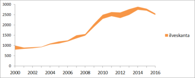 | Vuotta vanhempien ilvesten arvioitu yksilömäärä ennen metsästyskautta vuosina 2004–2018 koko Suomessa. Lähde: Luonnonvarakeskus. |