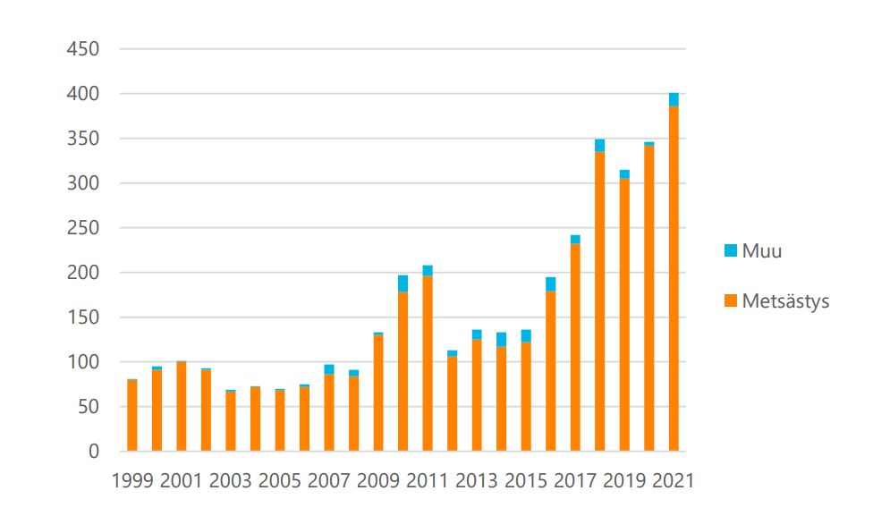 Kuva 2. Tunnettu karhujen kuolleisuus 1999-2021 metsästysvuosittain. Muu kuolleisuus sisältää myös vahinkoperusteiset poikkeusluvat. Lähde. Luonnonvarakeskus.