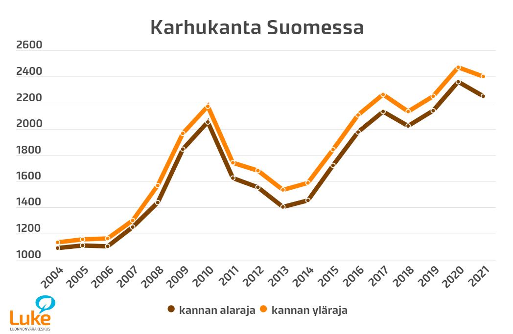 Kuva 1. Karhukannan kehitys vuosina 2004-2021. Viimeksi kuluneina neljänä vuotena karhua on metsästetty aiempaa voimakkaammin, ja kannan kasvu näyttäisi pysähtyneen. Lähde. Luonnonvarakeskus