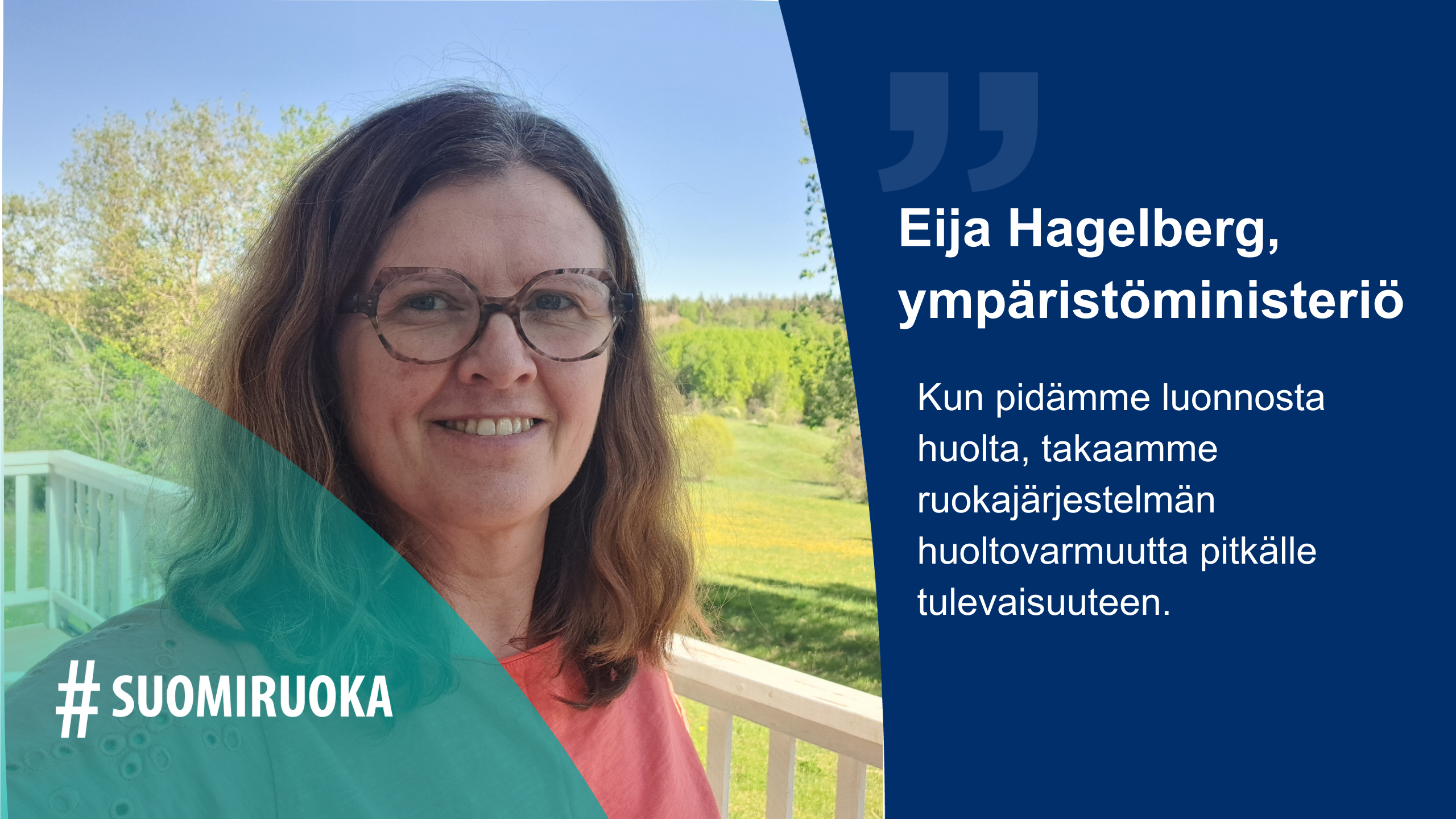 Suomalaisen ruuan ja luonnon ystävä Eija Hagelberg osallistui ruokastrategian valmisteluun sen työryhmän jäsenenä ja ohjausryhmän varajäsenenä. Kestävän ruuantuotannon edistäminen on hänen intohimonsa ja koko työuran johtotähti. Kotitarveviljelijä Eija työskentelee ympäristöministeriössä maatalouden erityisasiantuntijana.