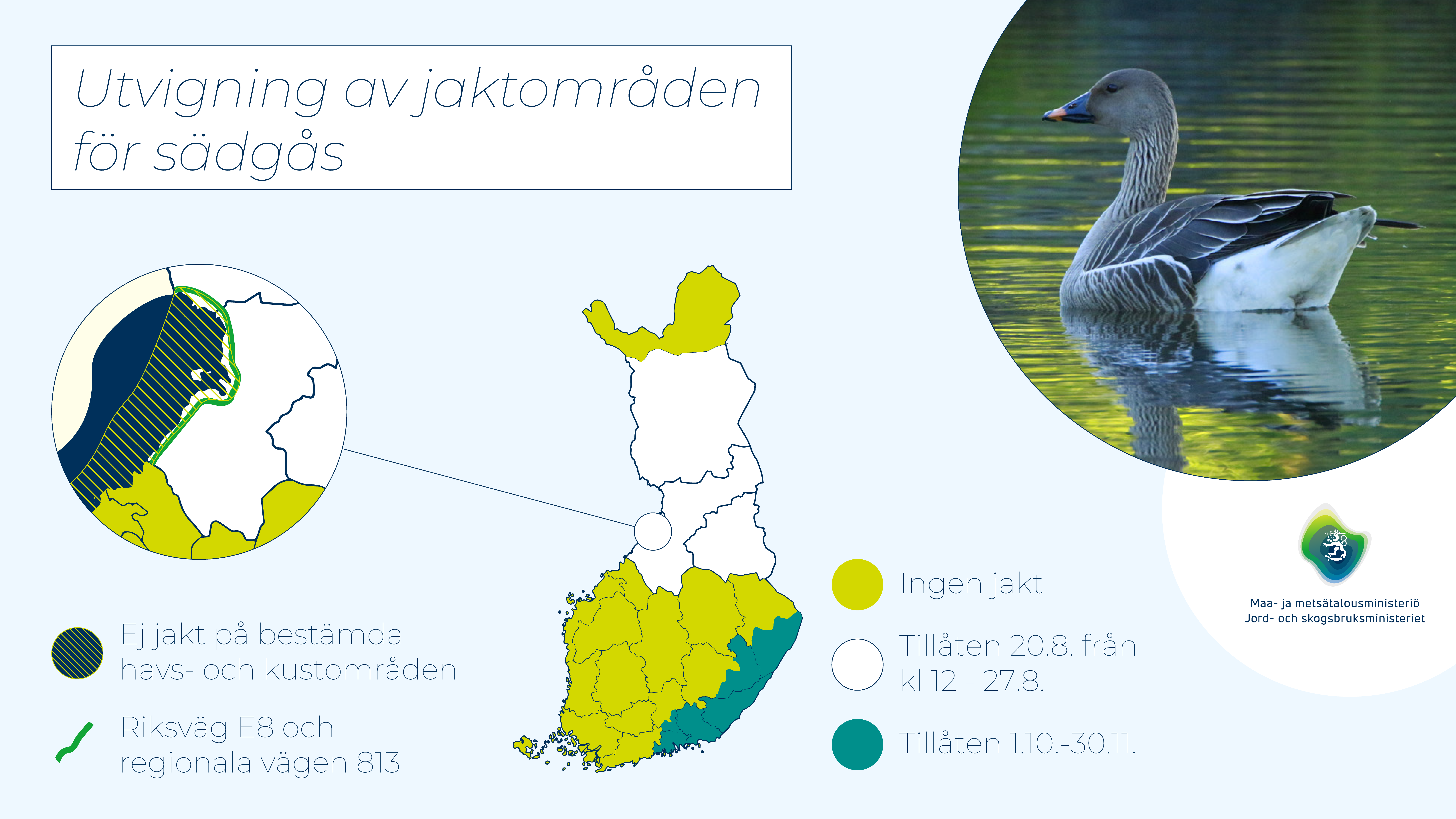 I sädgåsens häckningsområden i norra Finland är jakt på sädgås tillåten från den 20 augusti 2024 kl. 12 till den 27 augusti 2024 i landskapen Kajanaland, Lappland och Norra Österbotten, med undantag av kommunerna Enare, Enontekis och Utsjoki samt havssidan av riksväg E8 och den regionala vägen 813.