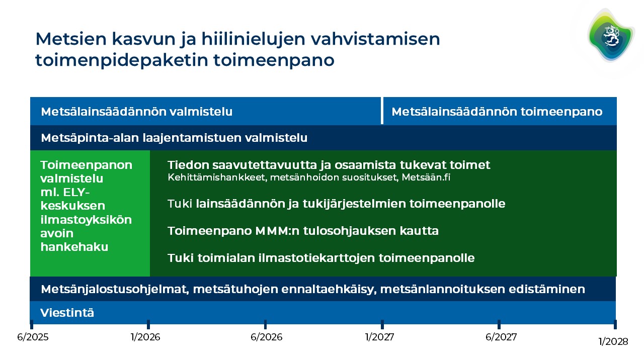 Toimenpidepaketti sisältää lainsäädännön muutoksia, taloudellista ohjausta ja sen kehittämistä sekä metsänomistajille ja metsäalan toimijoille suunnattua viestintää ja neuvontaa. Kokonaisuus tukee ilmastolain tavoitteiden saavuttamista ja kansallisen metsästrategian toimeenpanoa.