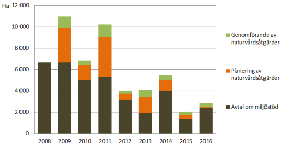 Genom Kemera-lagen skyddades 2016 sammanlagt 2 431 hektar, vilket är över 1 000 hektar mer än föregående år. Skillnaden förklaras delvis med att Kemera-författningarna har ändrats och att Skogscentralens datasystem förnyats med den påföljden att de avtal om miljöstöd som ingicks i slutet av 2015 överfördes till 2016. Miljöstödsobjekten var i genomsnitt 3,5 hektar stora, och största delen av områdena var skogar kring småvatten och moskogar med stort inslag av död ved. De mest betydande insatserna innebar skötsel av lundar, restaurering av småvatten och restaurering av myrar.