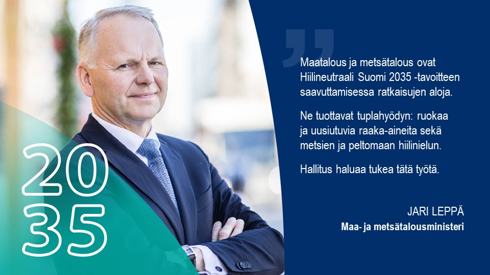 Hallitus asetti tavoitteeksi, että maankäyttösektorin hiilensidonta vahvistuu hallitusohjelman mukaisin toimin suhteessa nykytoimiin vähintään 3 miljoonalla hiilidioksiditonnilla vuoteen 2035 mennessä.