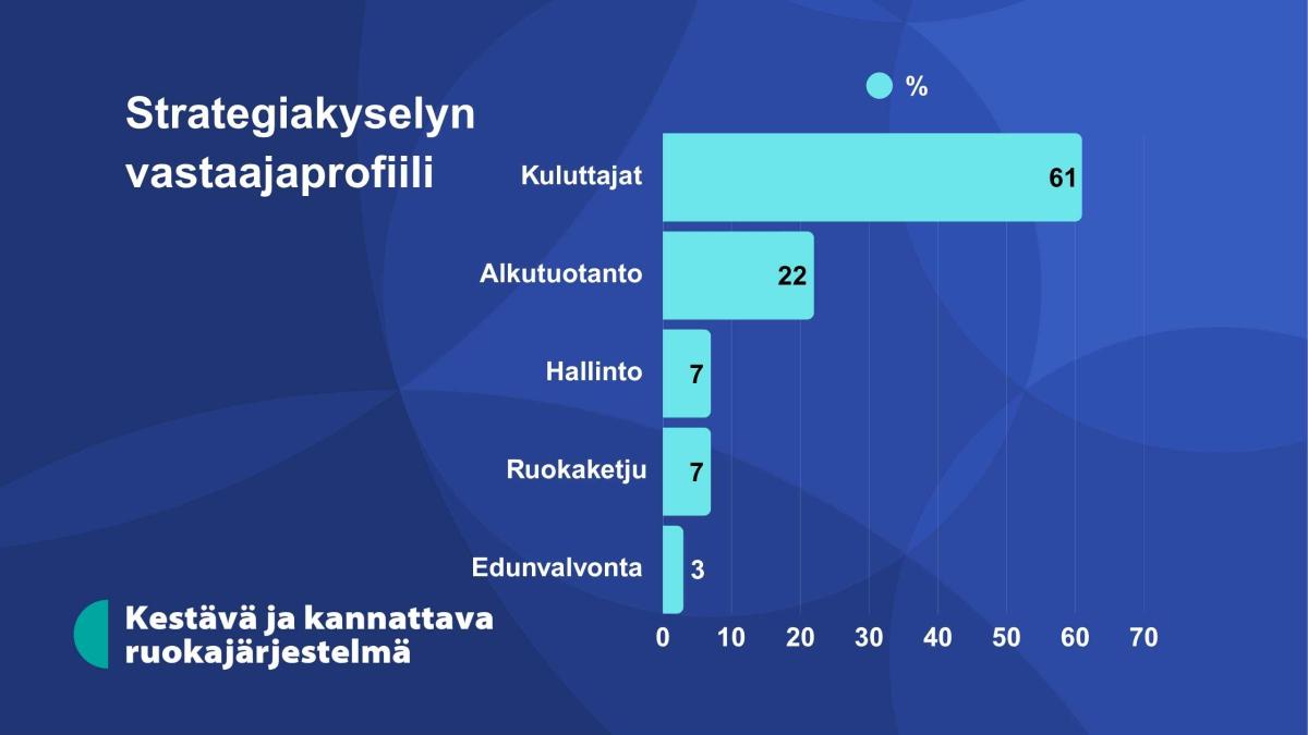Maa- ja metsätalousministeriön ruokastrategian valmisteluun liittyvä verkkokysely keräsi 12.3.–27.4.2025 välisenä aikana yhteensä 3768 vastausta. Kysely ylitti odotukset niin vastaajamäärän kuin sisällön monipuolisuuden osalta. Vastaajat edustivat laajasti ruokajärjestelmän eri osapuolia, suurimpina ryhminä kuluttajat ja alkutuottajat.
