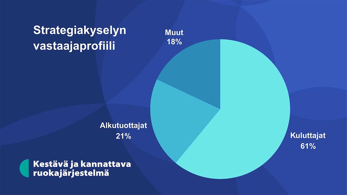 Avoinna olleeseen (12.3.-27.4.) strategiakyselyyn saatiin yli 3700 vastausta, joista suurin osa oli kuluttajilta. Tämä osoittaa, että ruokastrategia kiinnostaa tavallisia kuluttajia ja he pitävät suomalaista ruokatuotantoa tärkeänä. Maa- ja metsätalousministeriö haluaa lämpimästi kiittää kaikkia kyselyyn vastanneita.
