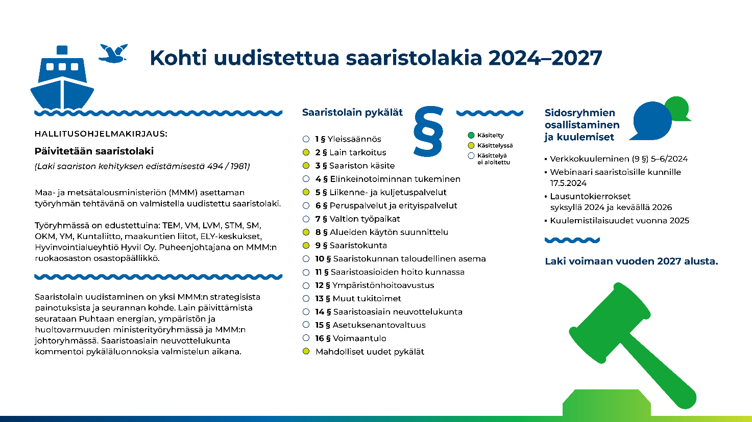 Saaristolain uudistaminen käynnistyi alkuvuodesta 2024. Lakia valmisteleva työryhmä on työstänyt tänä vuonna aktiivisesti saariston käsitettä ja saaristoista kuntaa koskevia säännöksiä. Kyseessä on merkittävät säännökset, sillä valtiovarainministeriön myöntämän kuntien peruspalveluiden valtionosuuden yhtenä määräytymistekijänä on kunnan saaristoisuus. Työn tavoitteena on ollut entistä täsmällisemmät ja läpinäkyvämmät säännökset.