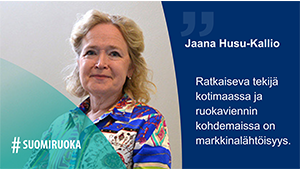 Jotta suomalaiset elintarvikkeet erottuvat maailmalla, tarvitaan valtavasti työtä sekä yksittäisissä yrityksissä että kansallisena yhteistyönä. Hyvää Suomesta -yhteistyö voi vientityöhön laajetessaan tuoda kaivattuja vientituloja kohtalaisella satsauksella. Suurlähetystöjen roolia kohdemaissa ei korvaa mikään. Food from Finland Office -tyyppiset palvelupisteet lähetystöjen yhteydessä moninkertaistaisivat parhaimmillaan toiminnan tuloksellisuutta. Business Finland on toimintojen rahoittajana oikeassa roolissaan. Myös investointeihin ja elintarvikeinnovaatioihin tulee satsata.
