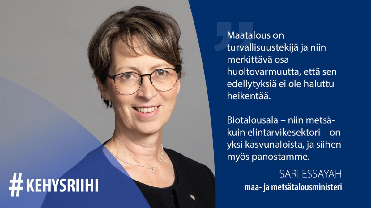 Maa- ja metsätalousministeri Sari Essayah pitää tärkeänä, että talouspaineiden keskellä hallitus haluaa luoda kasvun edellytyksiä ja huolehtia maan turvallisuudesta ja huoltovarmuudesta. Hallitus ei kohdista leikkauksia ruuantuotantoon.