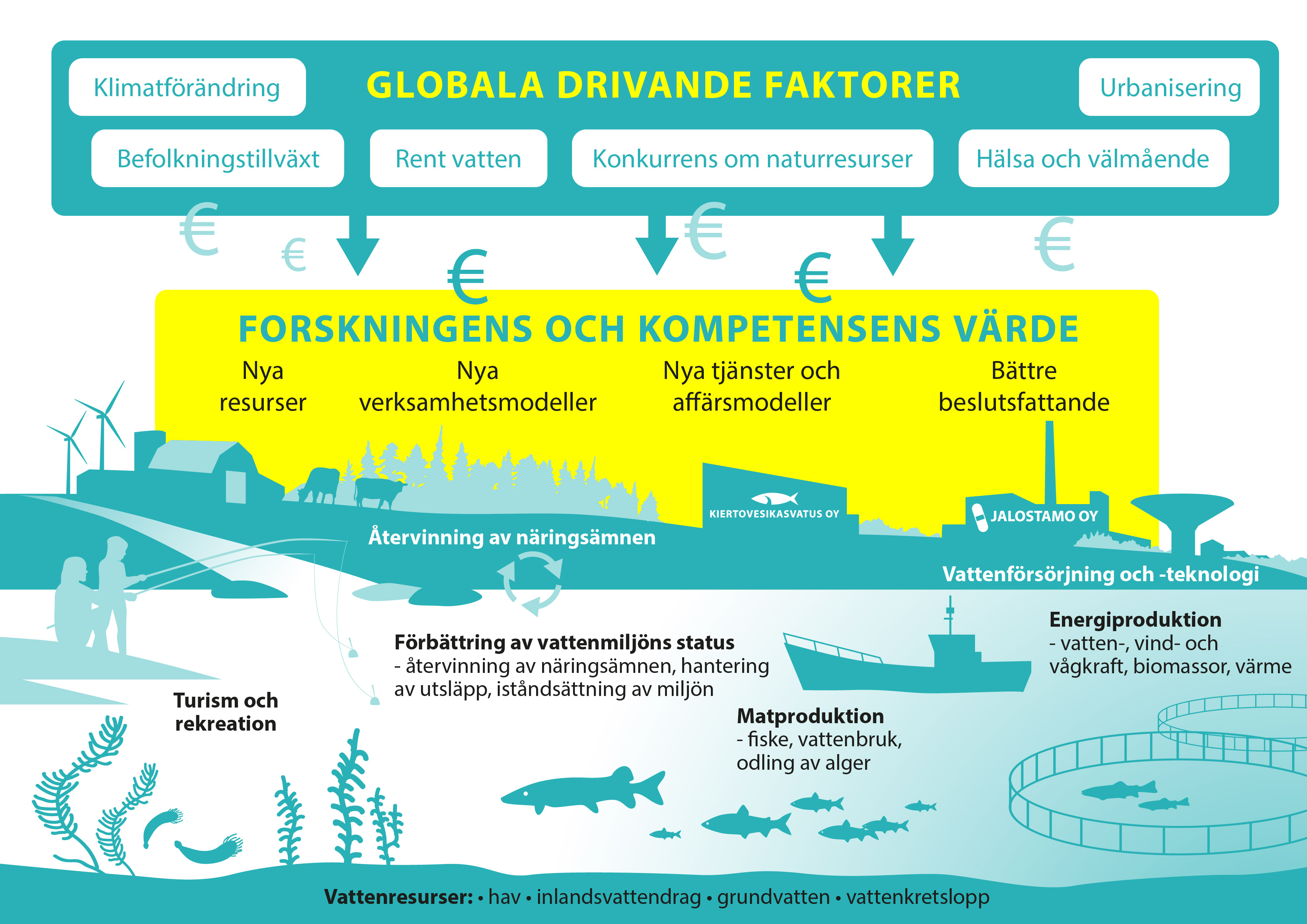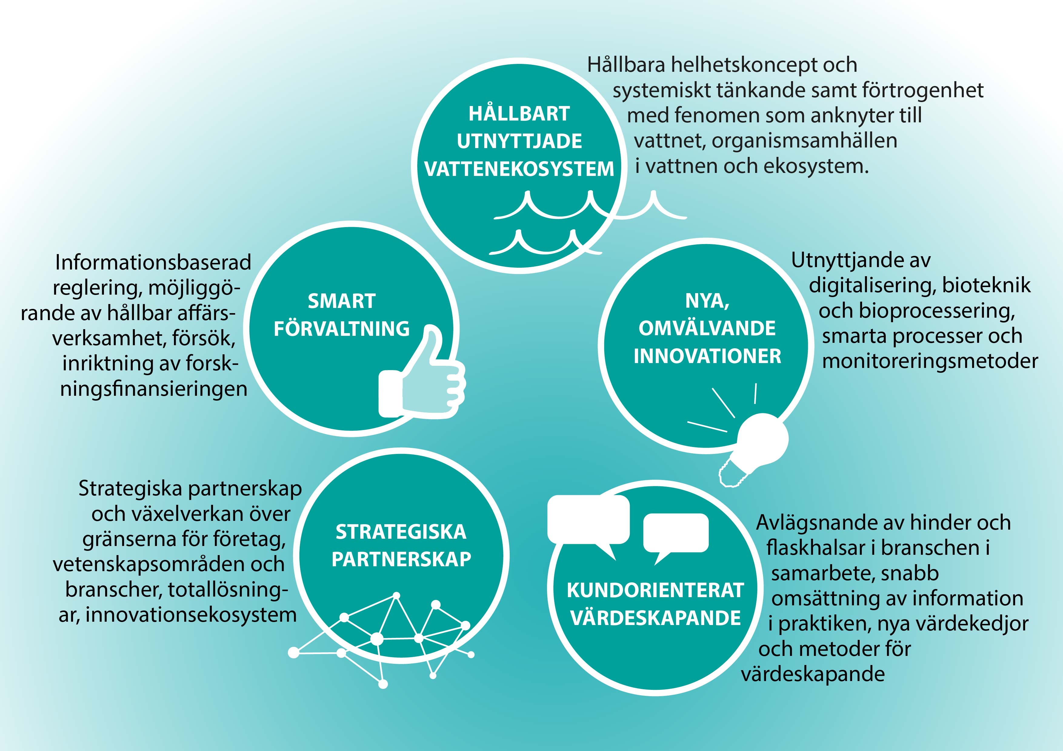 Innovationer möjliggör nya resurskretslopp samt helt nya lösningar för att förvalta och använda vatten och akvatiska naturresurser. Det är viktigt att vi skapar förutsättningar för nya innovationer.  Digitaliseringen och metoderna inom bioteknologi och -processering, som utvecklas snabbt, gör det möjligt att utveckla högvärdesprodukter och nya tjänster.
