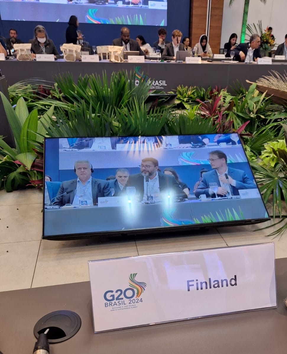 Maailman johtavien talouksien muodostama G20-ryhmä valmistelee tämän vuoden aikana korkean tason periaatteita biotaloudesta puheenjohtajamaa Brasilian johdolla. Suomi on mukana jakamassa näkemyksiään yhtenä kolmesta G20-biotalousaloitteeseen kutsutusta ryhmän ulkopuolisesta maasta. Parhaillaan käynnissä olevassa kokouksessa maa- ja metsätalousministeriö esittelee suomalaista metsätaloutta ja biotaloutta.