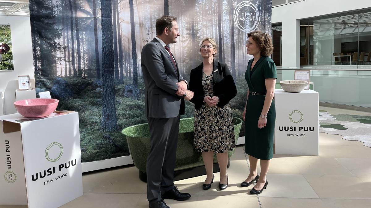 Jord- och skogsbruksminister Sari Essayah och två EU-kommissionärer öppnade på måndagen utställningen Uusi Puu (sv. nytt trä) i Bryssel, där Finland visar träbaserade bioekonomiska lösningar som baserar sig på finländskt kunnande.