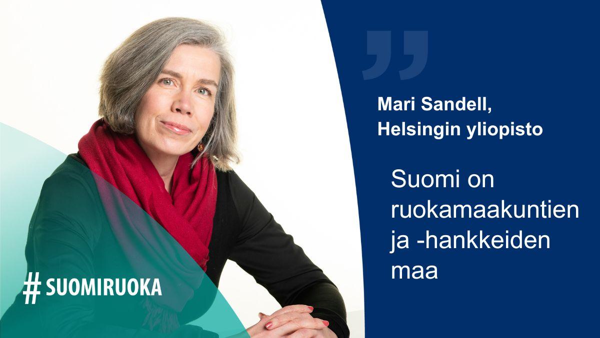 Mari Sandell on Helsingin yliopiston maatalous-metsätieteellisen (MMTDK) tiedekunnan yhteiskunnallisesta vuorovaikutuksesta ja innovaatioista vastaava varadekaani sekä elintarvike- ja ravitsemustieteiden osaston professori. Hän on professori (20 %) myös Turun yliopiston ravitsemus- ja ruokatutkimuskeskuksessa (aiemmin Funktionaalisten elintarvikkeiden kehittämiskeskus). MMTDK:n toiminta ruokasektorilla jakautuu Helsinkiin ja laajemmin Uudellemaalle, Etelä-Pohjanmaalle, Etelä-Savoon ja Päijät-Hämeeseen. Yliopistotasoinen opetus kattaa koko ruokajärjestelmän pellolta pöytään ja mullasta masuun. Sandell edustaa valtiosihteeri Nergin vetämässä Kestävä ja kannattava ruokajärjestelmä -kokonaisuuden ohjausryhmässä korkeakoulusektoria.