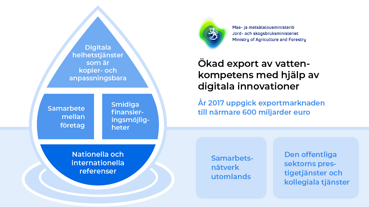 Finland har potential att bli en central vattenaktör och producent av vattentjänster på internationell nivå. Enligt Finlands vision producerar digitala lösningar en uppsättning tjänster som tillgodoser kundernas behov. Lösningarna ska också vara kopierbara och anpassningsbara.