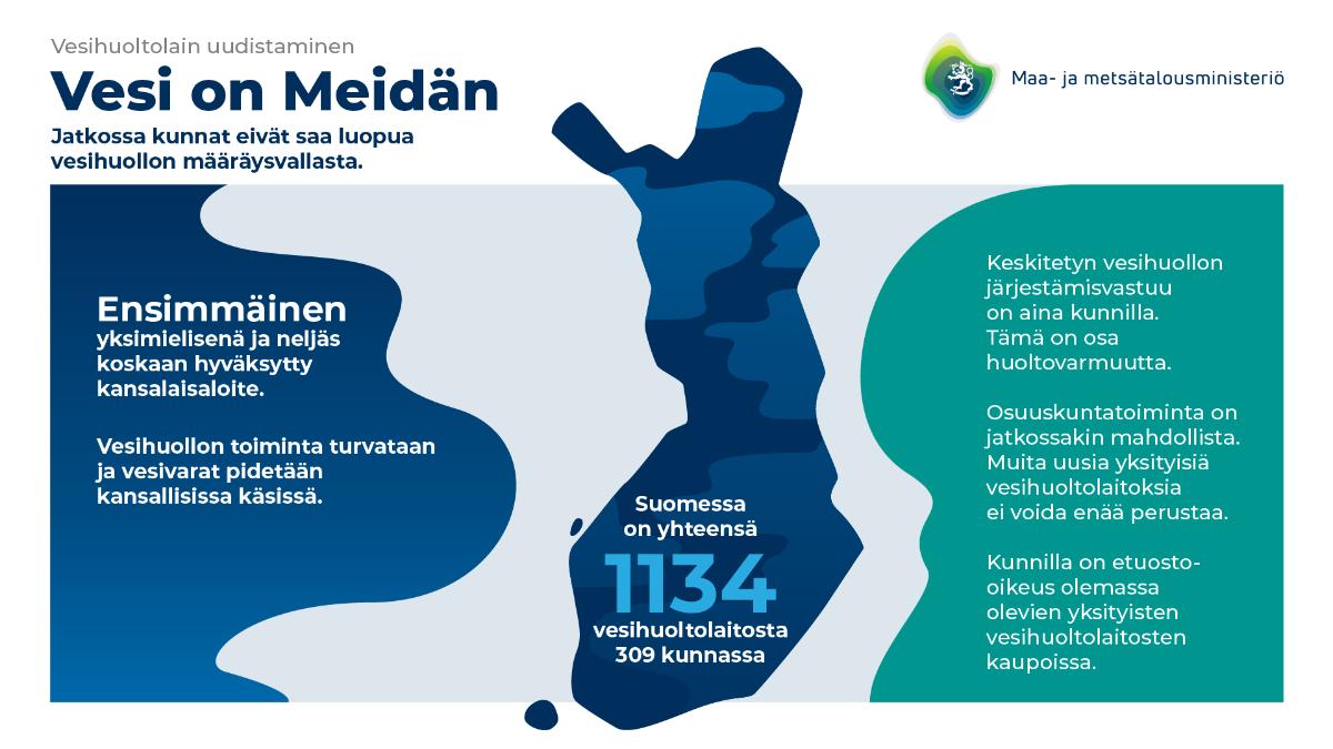 Vesihuoltolain uudistuksesta on käyty julkisuudessa vilkasta keskustelua. Osana vesihuoltolain uudistamista maa- ja metsätalousministeriö viimeistelee parhaillaan lainsäädäntöratkaisua eduskunnan päätöksen mukaisesti Vesi on meidän -kansalaisaloitteen toimeenpanemiseksi.