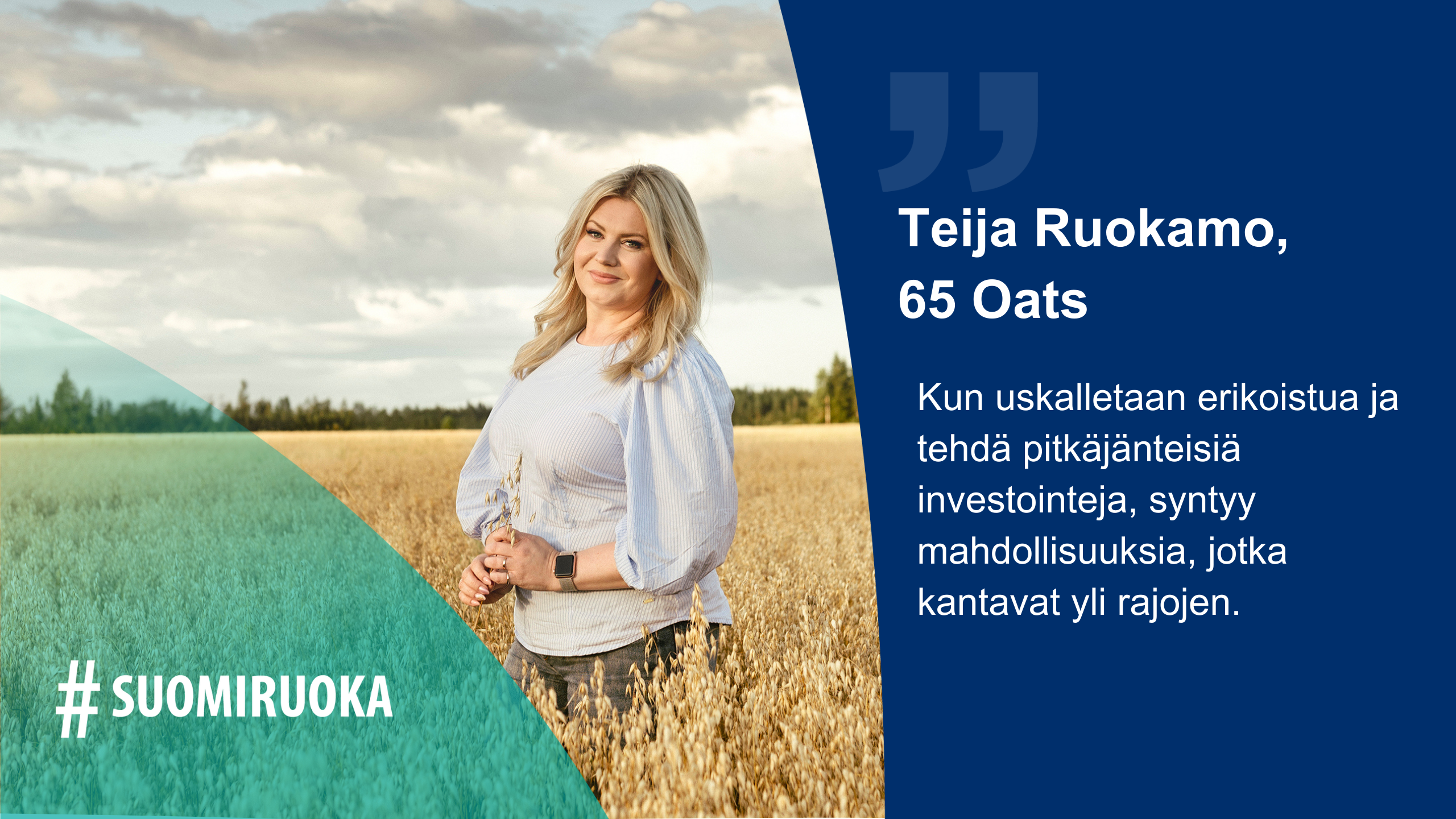 Teija Ruokamo on Kinnusen Myllyn 65 Oats - gluteenittomien kauratuotteiden vientipäällikkö, joka suhtautuu intohimolla ruokaan ja kotimaiseen ruuan tuotantoon.