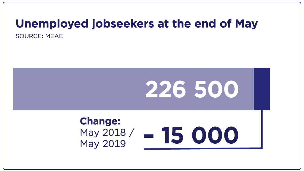 A total of 226,500 unemployed jobseekers were registered at the Employment and Economic Development Offices at the end of May. This was 15,000 fewer than a year earlier. The number of unemployed jobseekers decreased by 3,100 from the previous month. The figures are from the Employment Service Statistics of the Ministry of Economic Affairs and Employment.