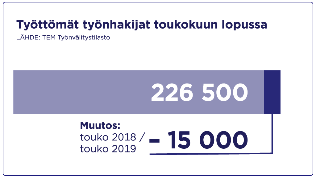 Työ- ja elinkeinotoimistoissa oli toukokuun lopussa yhteensä 226 500 työtöntä työnhakijaa. Se on 15 000 vähemmän kuin vuotta aikaisemmin. Työttömien työnhakijoiden määrä väheni edellisestä kuusta 3 100:lla. Tiedot ilmenevät työ- ja elinkeinoministeriön Työllisyyskatsauksesta.