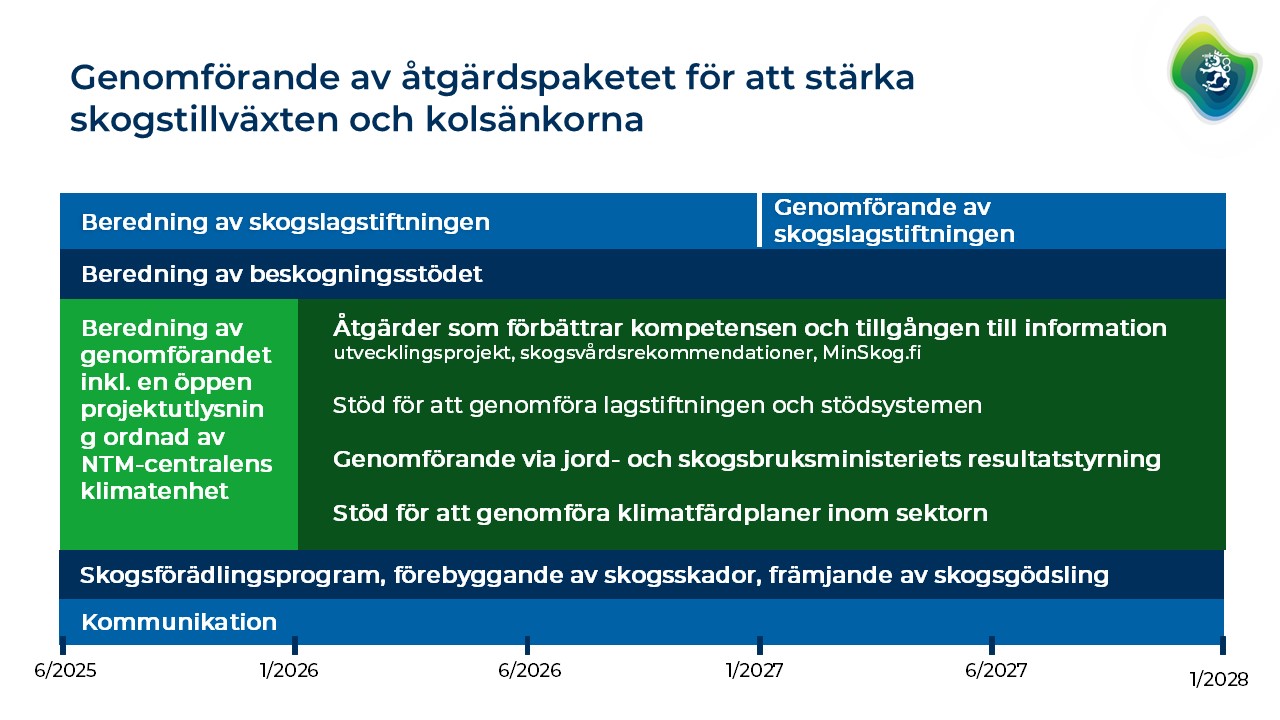 I samband med halvtidsöversynen och den andra tilläggsbudgeten för 2025 drog regeringen upp riktlinjer för styrmedlen för och finansieringen av klimatåtgärder i anslutning till skogar. Det stora åtgärdspaketet för att stärka skogstillväxten och kolsänkorna förbättrar beredskapen för skogsskador och konsekvenser av klimatförändringar. Genom åtgärderna påskyndar man också vitaliseringsgödslingen, utvidgningen av skogsarealen, skogstillväxten och kolbindningen.