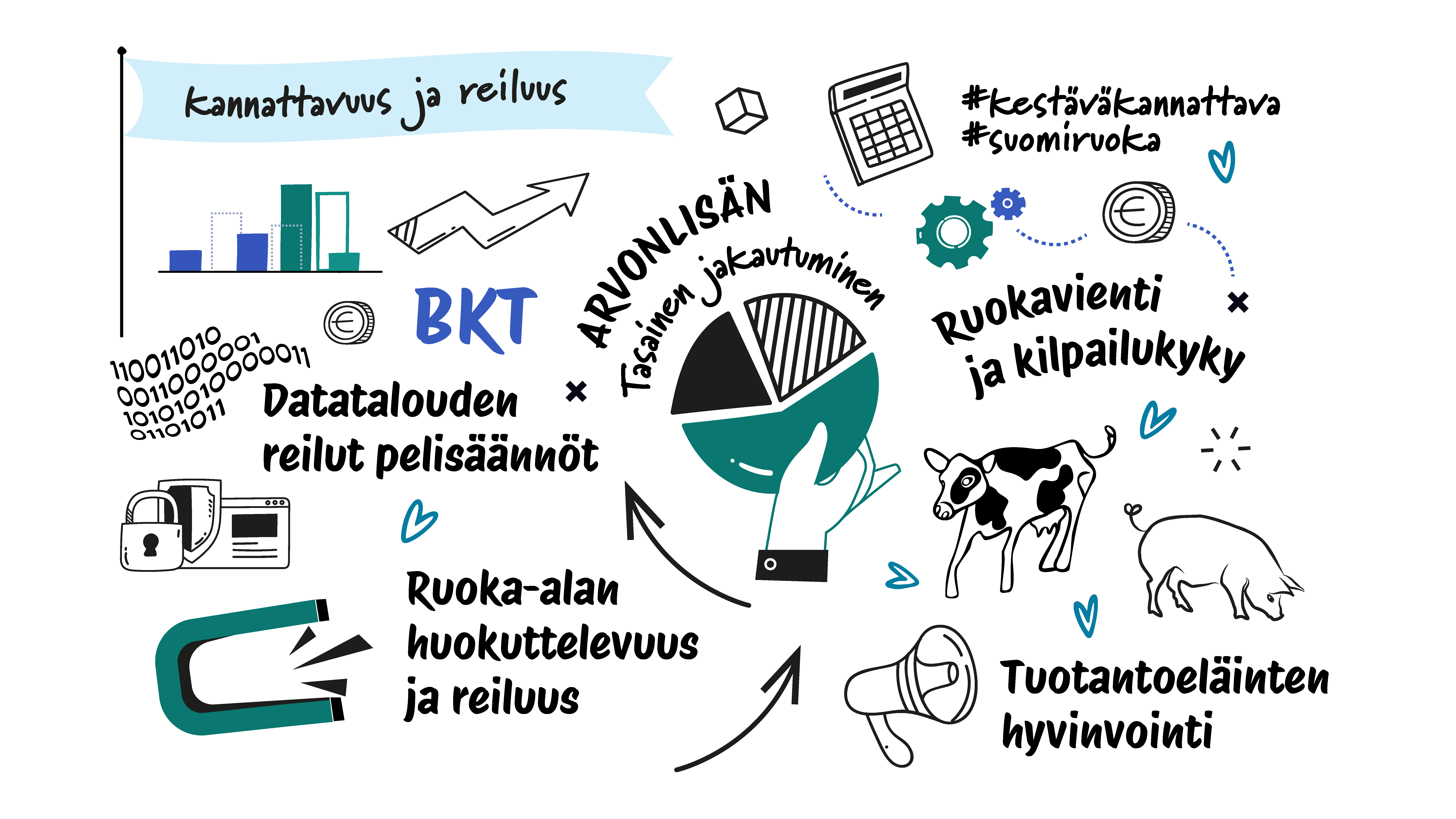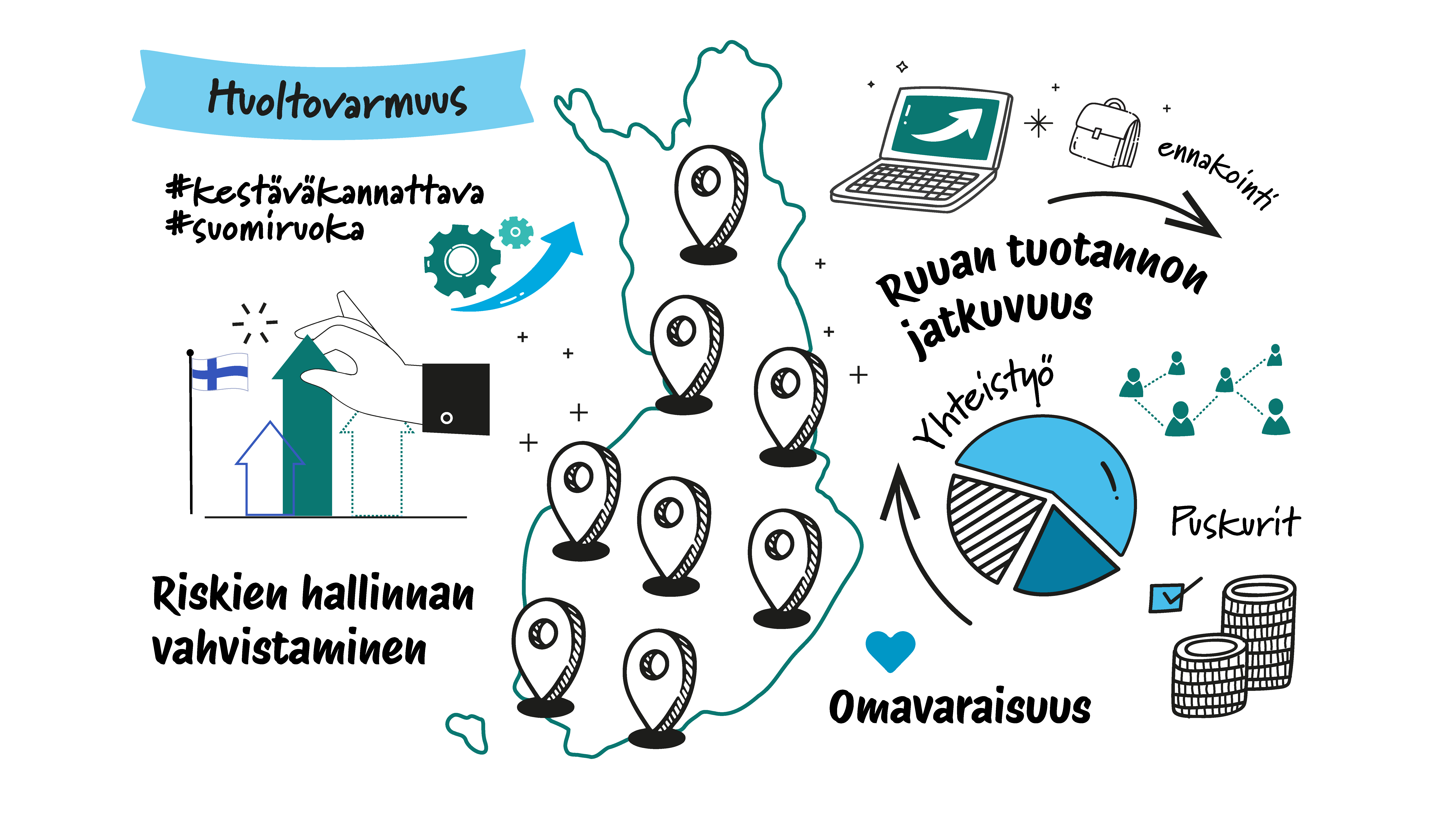 Strategian tavoitteena on luoda yhteinen, ohjaava ja mahdollistava viitekehys kestävän ja kannattavan ruokajärjestelmän rakentamiseksi.