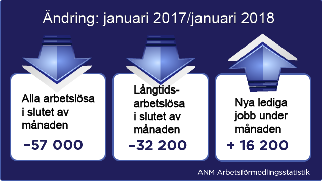 Vid arbets- och näringsbyråerna fanns det i slutet av januari sammanlagt 285 800 arbetslösa arbetssökande. Det är 57 000 färre än ett år tidigare. Från föregående månad minskade antalet arbetslösa arbetssökande med 9 700. Uppgifterna framgår av arbets- och näringsministeriets sysselsättningsöversikt.