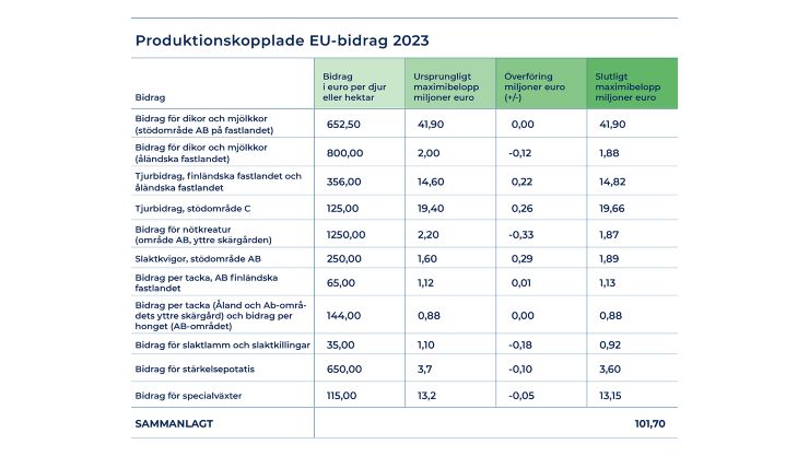 Medlen ska i första hand överföras till åtgärder som håller på att underskrida den minimibidragsnivå som anges i GJP-planen. I fråga om år 2023 skedde detta i fråga om tjurbidrag och bidrag för slaktkvigor, för vilka maximibeloppet höjdes. De slutliga enhetsnivåerna och maximibeloppen för de produktionskopplade ersättningarna finns i tabellen nedan.