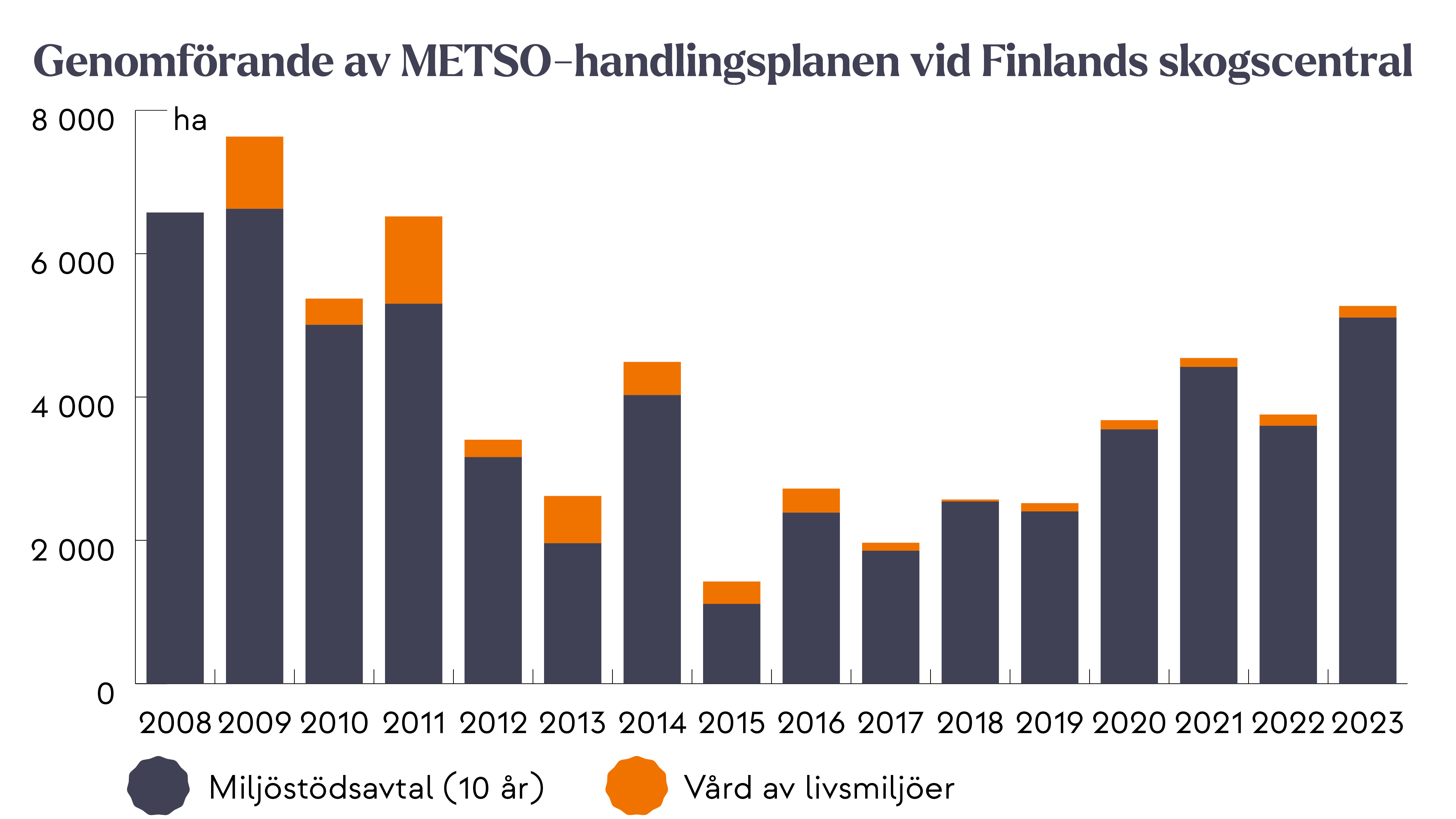 Ett annat centralt mål för METSO-programmet är att miljöstödsavtal ska ingås för och naturvårdsarbeten ska utföras på 82 000 hektar fram till 2025. Fjolårets resultat när det gäller uppnåendet av detta mål var sammanlagt 5 400 hektar, vilket är klart bättre än de senaste årens resultat. Det innebär att 79 procent av målet har uppnåtts, det vill säga cirka 65 000 hektar.