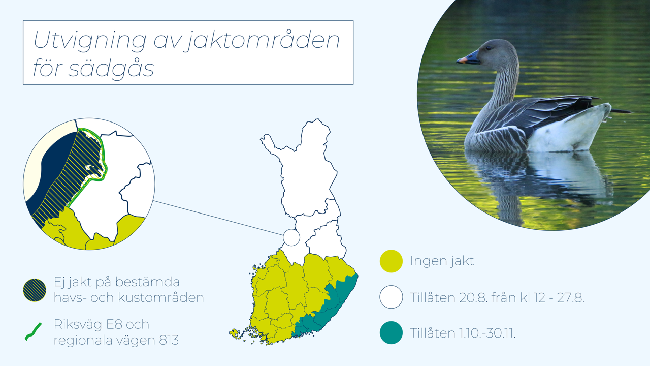 Enligt förslaget ska dock jakt på sädgås tillåtas på ett större område än i fjol. Efter en paus på 10 år blir det möjligt att fortsätta den traditionella jakten på sädgås i norr, bland annat i Kajanaland. De övriga områdena i norr finns i Lappland och Norra Österbotten. Förslaget grundar sig på Finlands viltcentrals framställning och resultaten av Naturresursinstitutets inventering av sädgåsbeståndet.