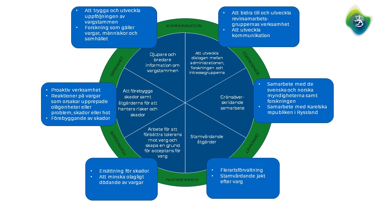 Bild: De centrala målen för förvaltningsplanen för vargstammen visas i mitten av bilden Åtgärderna som hänför sig till målen finns vid utkanten av cirkeln. |