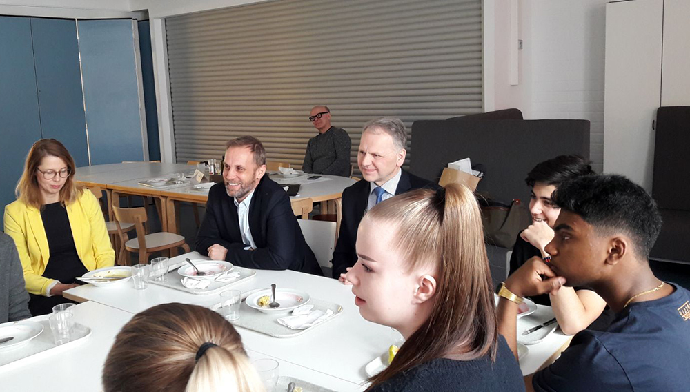 Jord- och skogsbruksminister Jari Leppä besökte Länsimäki skola i Vanda och träffade niondeklassare i skolans matsal. Med besöket ville ministern uppmärksamma skolmaten.