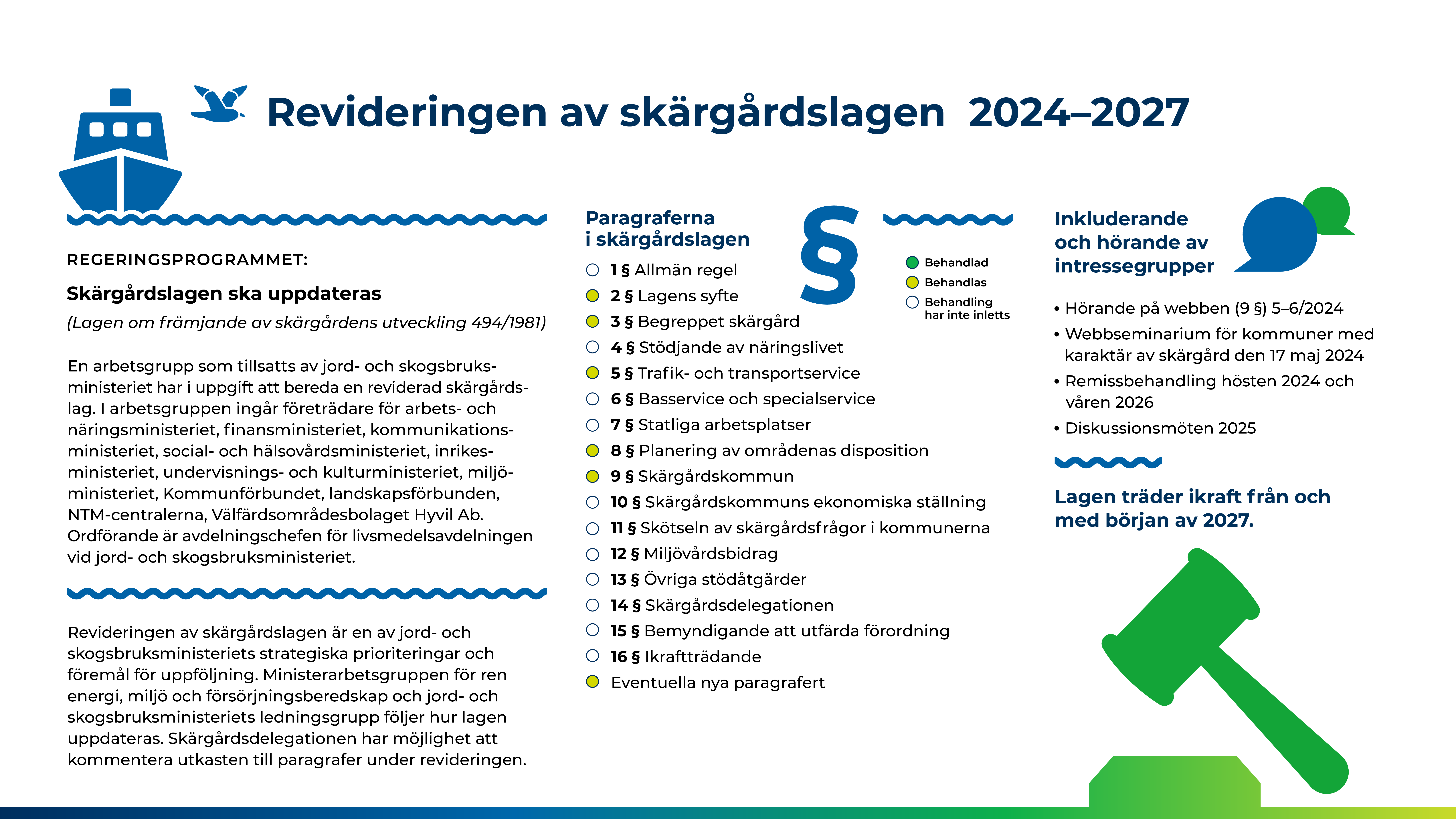 Arbetet med att revidera skärgårdslagen fortsätter intensivt under 2025. I samband med det kommer det att ordnas diskussionsmöten, även regionala sådana. Det planeras att nya paragrafer ska fogas till lagen. Målet är att den reviderade lagen ska träda i kraft vid ingången av 2027.