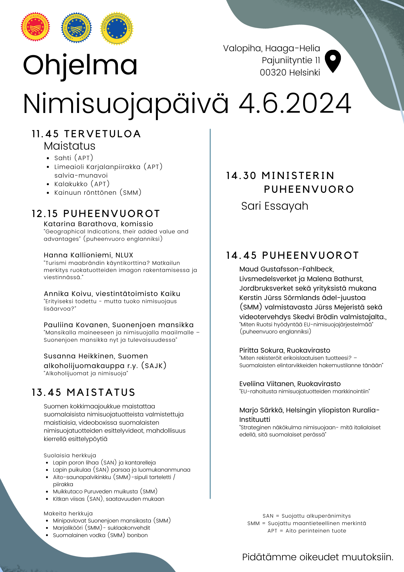 Tapahtumassa Suomen kokkimaajoukkueen jäsenet maistattavat suomalaisista nimisuojatuotteista tehtyjä herkullisia suupaloja ja yritykset esittelevät omia nimisuojatuotteitaan.